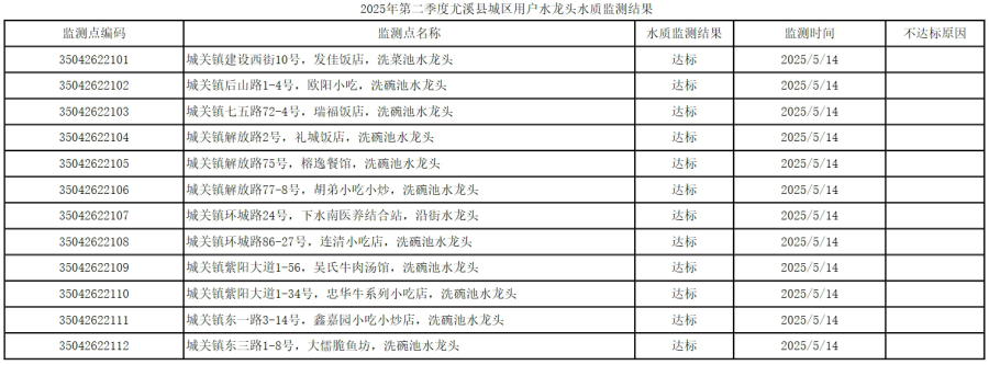 附:2025年第二季度尤溪縣城區用戶水龍頭水質監測結果